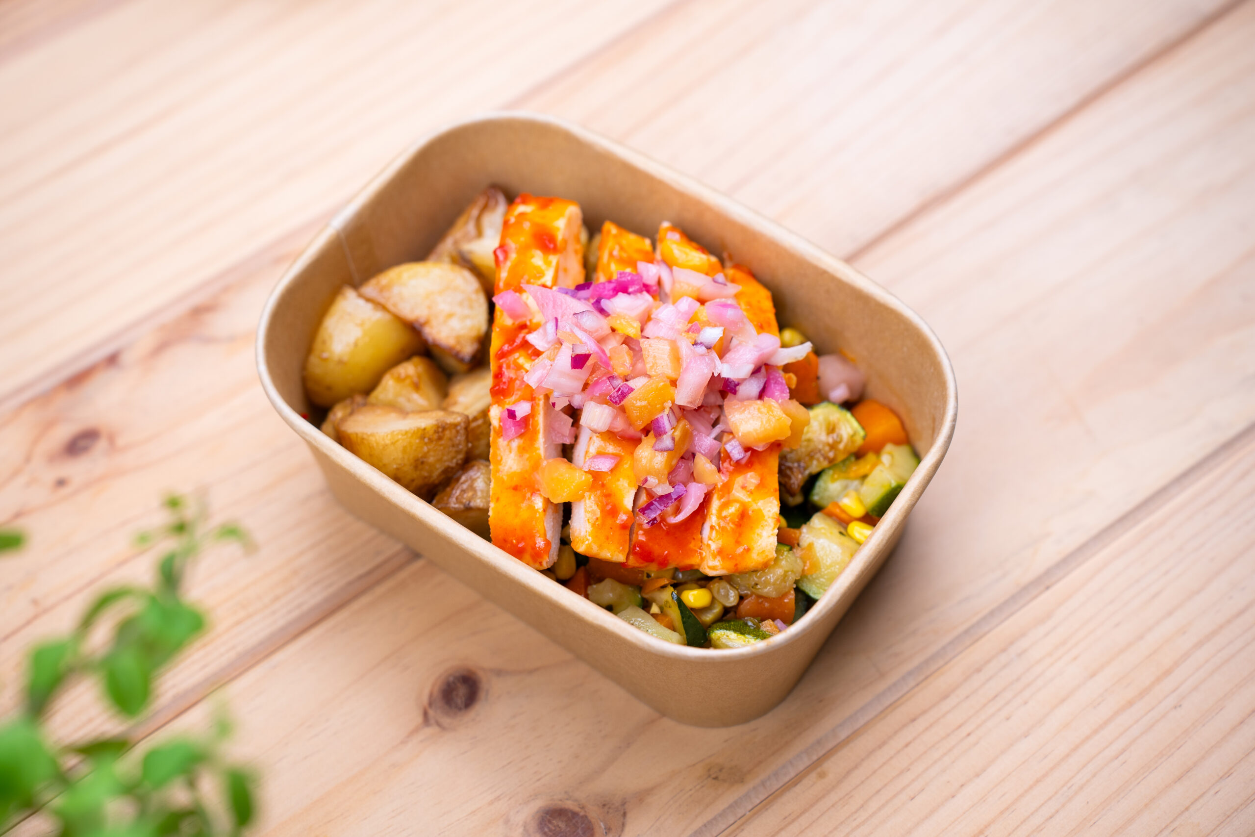 Peito de frango sem pele, pimento vermelho, geleia de malagueta, azeite virgem extra, vinagre de maçã, farinha de amêndoa, alho, levedura de cerveja, paprika fumada, sal fino, pimenta preta, cominhos moídos e alho em pó.