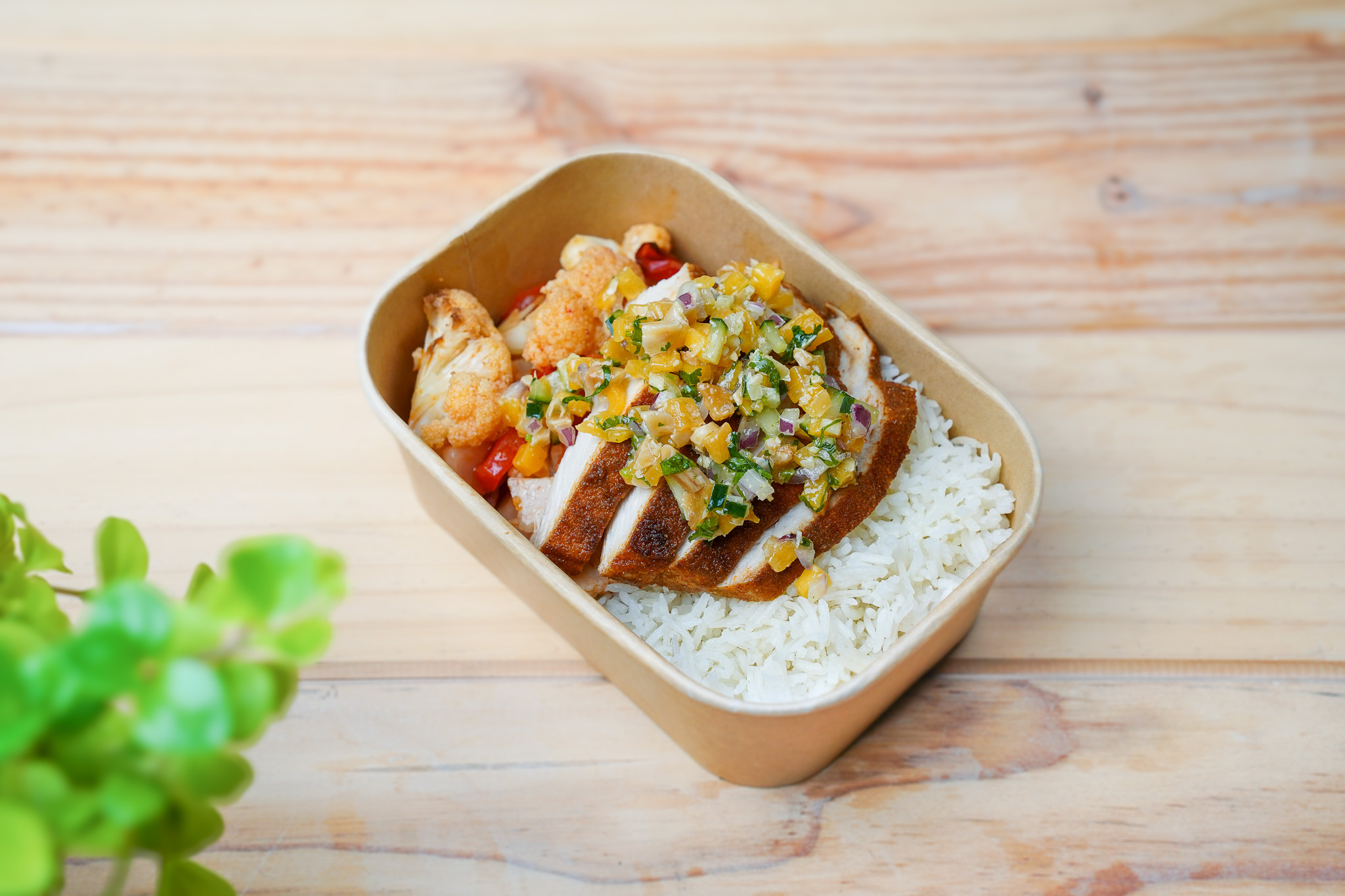 Peito de frango marinado em tempero tandoori com iogurte vegetal de coco e limão, assado até ficar suculento e aromático. Servido com uma salada fresca de pêssego, pepino, cebola roxa e amêndoas torradas, com coentros e gengibre para um toque vibrante e exótico.