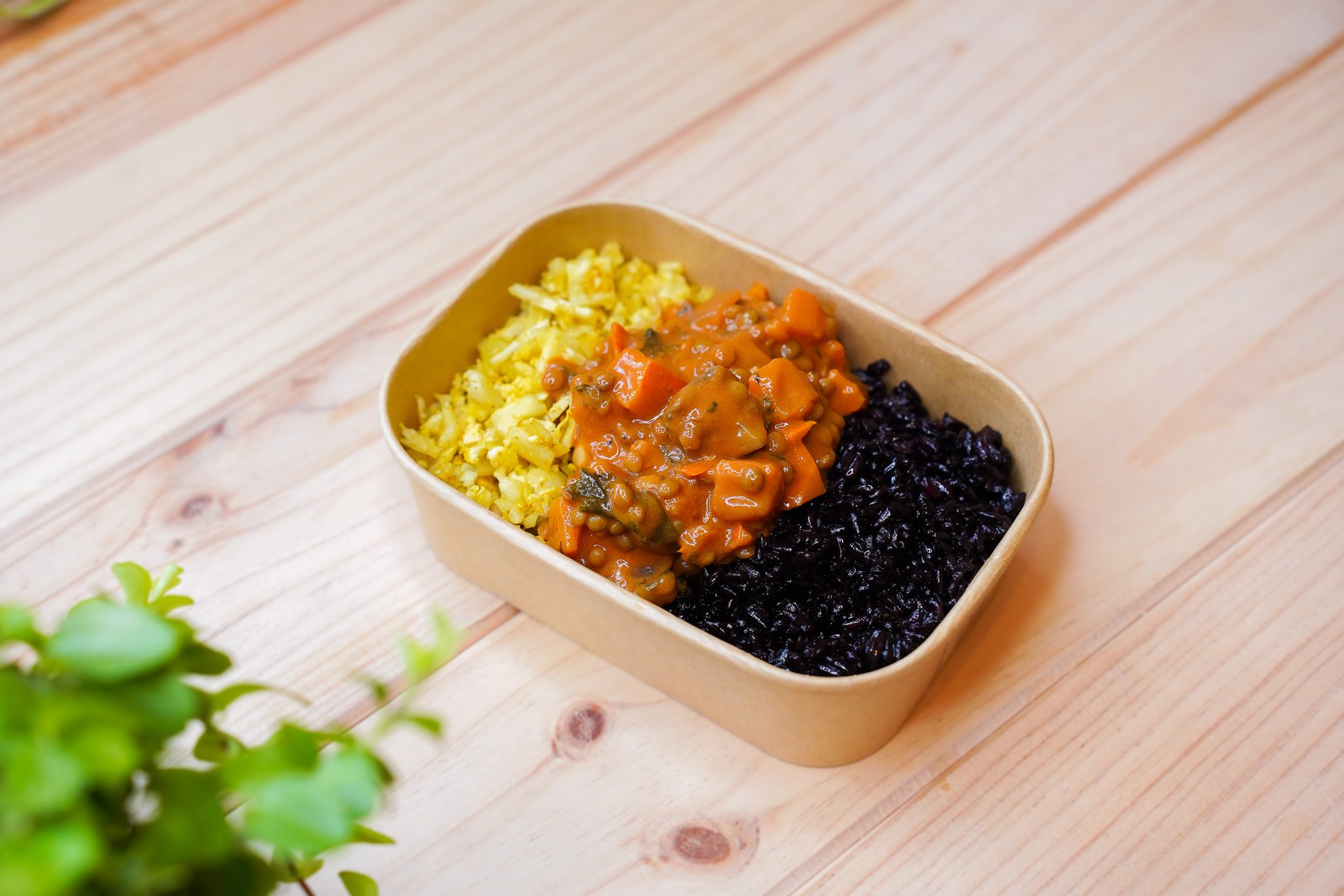Ingredientes: abóbora hokaido fresca, lentilhas castanhas biológicas, couve kale, cogumelos paris, tomate cru, polpa tomate, cebola, leite de coco biológico, azeite virgem extra, alho em pasta, sal marinho, alecrim seco, pimenta preta, tomilho seco;