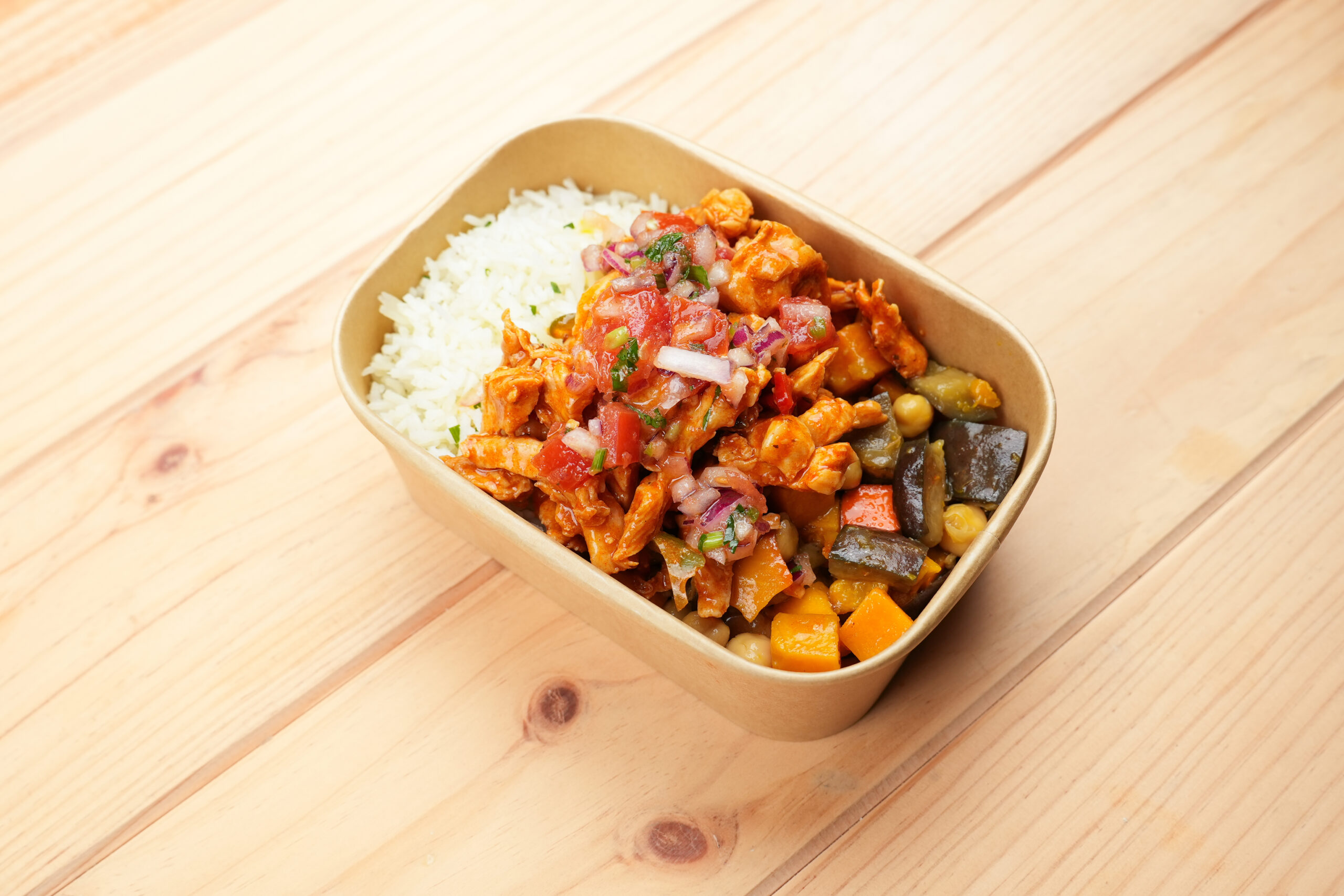 Peito de frango, pimento vermelho, pimento verde, tomate concentrado, azeite virgem extra, sumo de lima, mistura de especiarias (paprika fumada, cebola em pó, orégãos secos, pimenta preta, açúcar de coco biológico, cominhos, sal fino, pimenta caiena), pico de gallo (tomate, cebola roxa, coentros frescos, sumo de lima, sal fino).