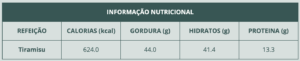 Panquecas paleo (farinha de amêndoa sem pele, açúcar de coco biológico, ovo inteiro líquido pasteurizado, fécula de batata, gema de ovo líquida pasteurizada, manteiga de amêndoa, bicarbonato de sódio, aroma de baunilha, sal fino), creme de tiramisu (leite de coco biológico, caju cru sem pele, mel de flores, óleo de coco desodorizado biológico, aroma de baunilha, sal fino), café expresso, cacau cru em pó.